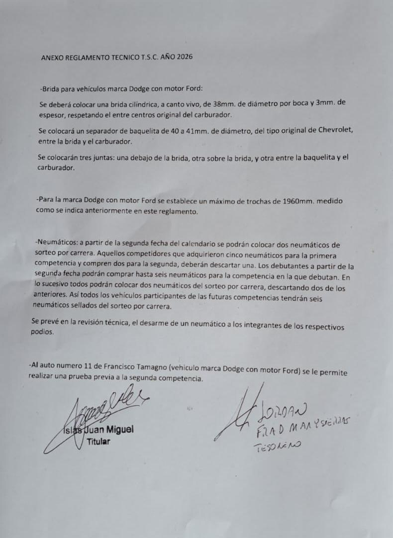 Mediante un anexo reglamentario, se informa de las modificaciones técnicas para los autos marca Dodge con motor Ford. Además se limitan los neumáticos en el sorteo y se autoriza a Francisco Tamagno realizar una prueba previo a la segunda competencia.